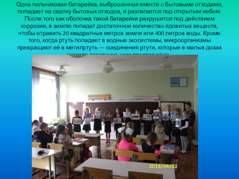 Слайд 7. И так, одна пальчиковая батарейка, выброшенная на мусорную свалку, загрязняет