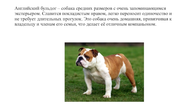 Слайд 5Английский бульдог – собака средних размеров с очень запоминающимся экстерьером. Славится