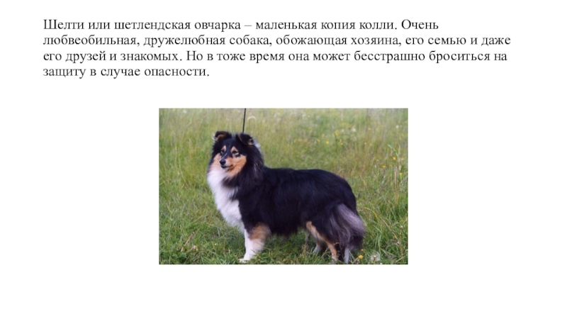 Слайд 7Шелти или шетлендская овчарка – маленькая копия колли. Очень любвеобильная, дружелюбная