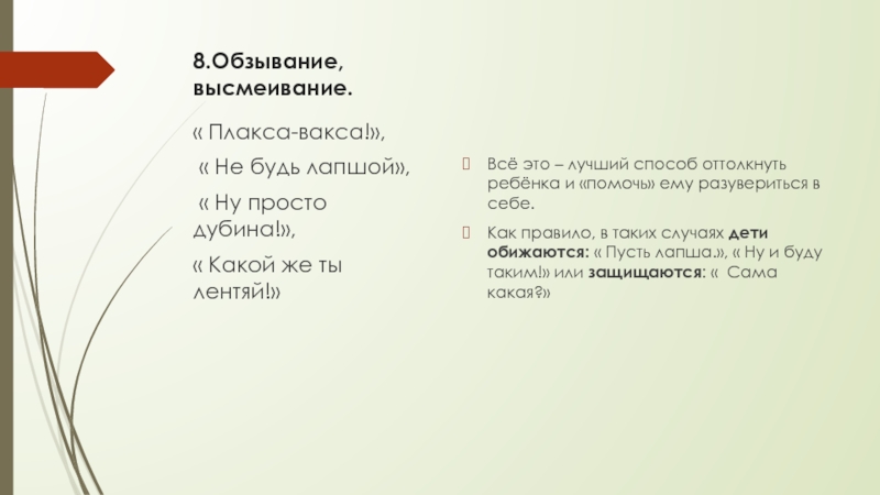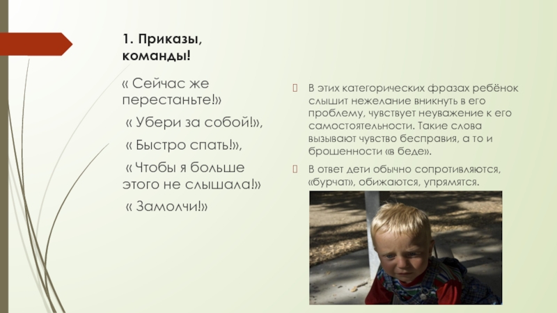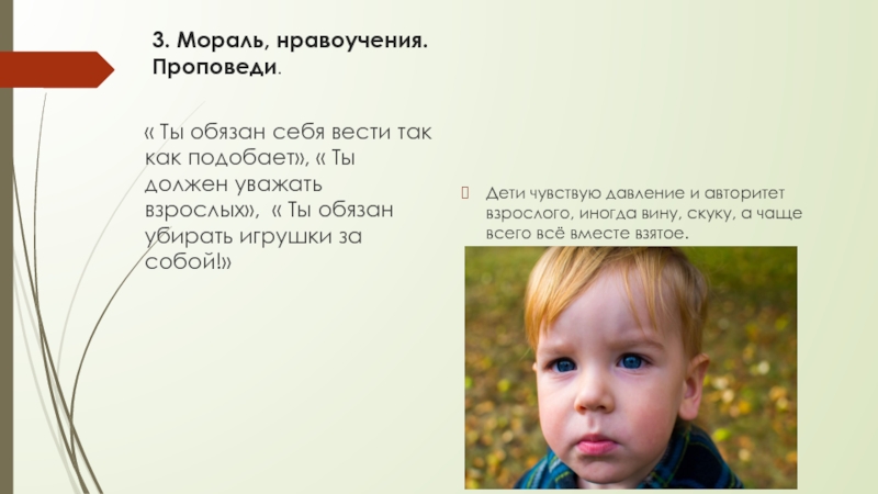 « Ты обязан себя вести так как подобает», « Ты должен уважать взрослых», « Ты обязан убирать игрушки за собой!»
