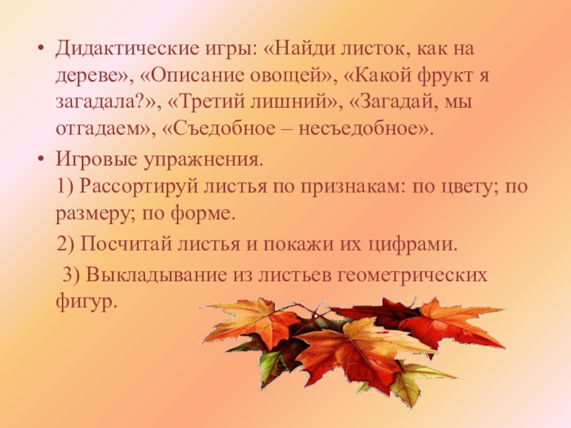Дидактические игры: «Найди листок, как на дереве», «Описание овощей», «Какой фрукт