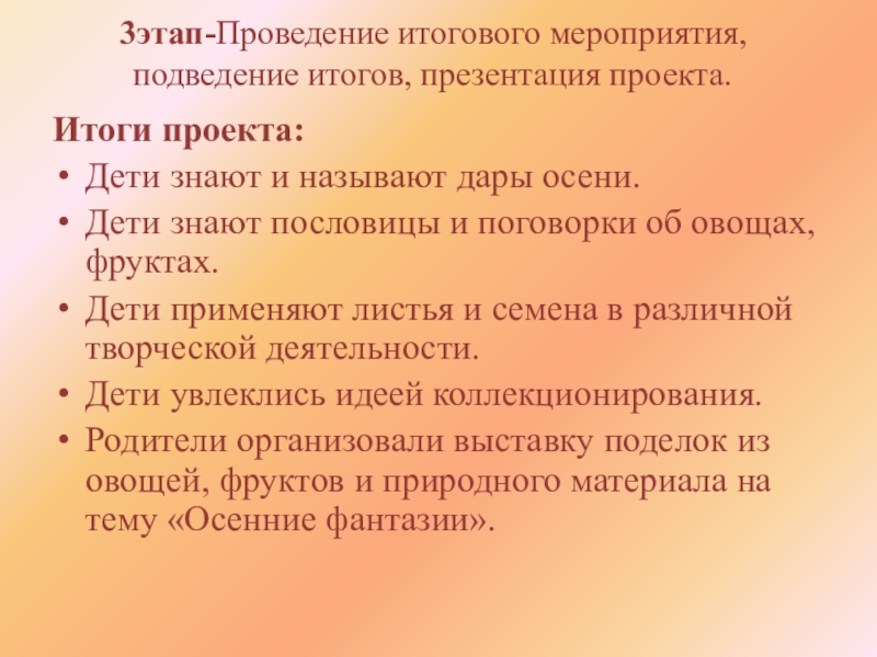 Слайд 203этап-Проведение итогового мероприятия, подведение итогов, презентация проекта.