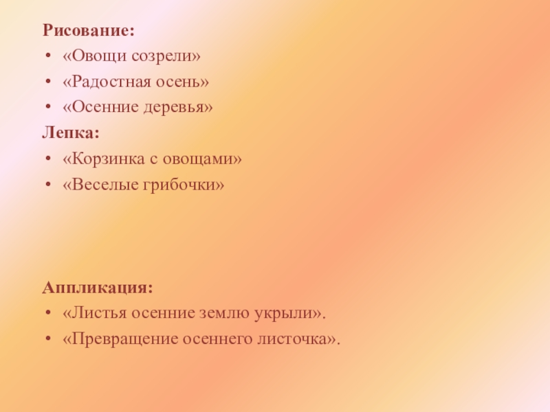 к деревьям», «Осень –волшебница», «Описание овощей», «Овощи и фрукты – полезные продукты».