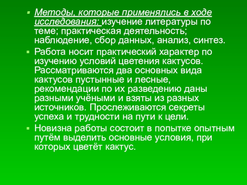 Новизна работы состоит в попытке опытным путём выделить основные условия, при которых цветёт кактус.