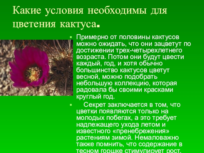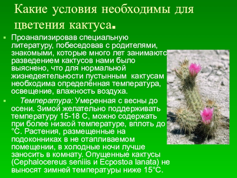 Слайд 8Какие условия необходимы для цветения кактуса.