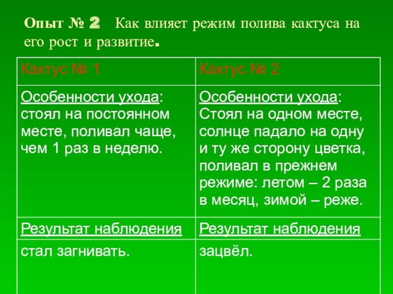 Слайд 15Опыт № 2 Как влияет режим полива кактуса на его