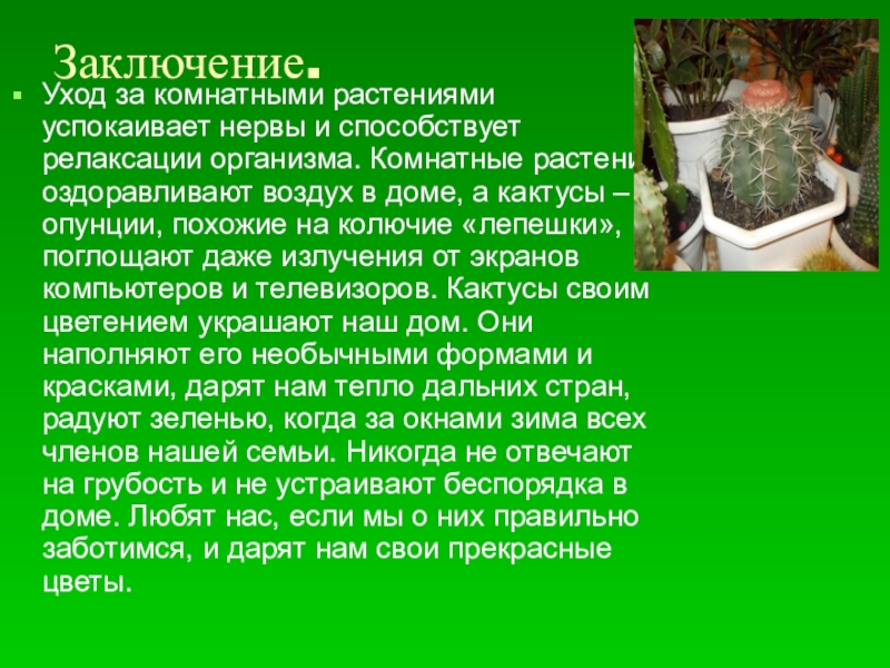растения оздоравливают воздух в доме, а кактусы – опунции, похожие на колючие «лепешки», поглощают даже излучения от экранов компьютеров и телевизоров. Кактусы своим цветением украшают наш дом. Они наполняют его необычными формами и красками, дарят нам тепло дальних стран, радуют зеленью, когда за окнами зима всех членов нашей семьи. Никогда не отвечают на грубость и не устраивают беспорядка в доме. Любят нас, если мы о них правильно заботимся, и дарят нам свои прекрасные цветы.