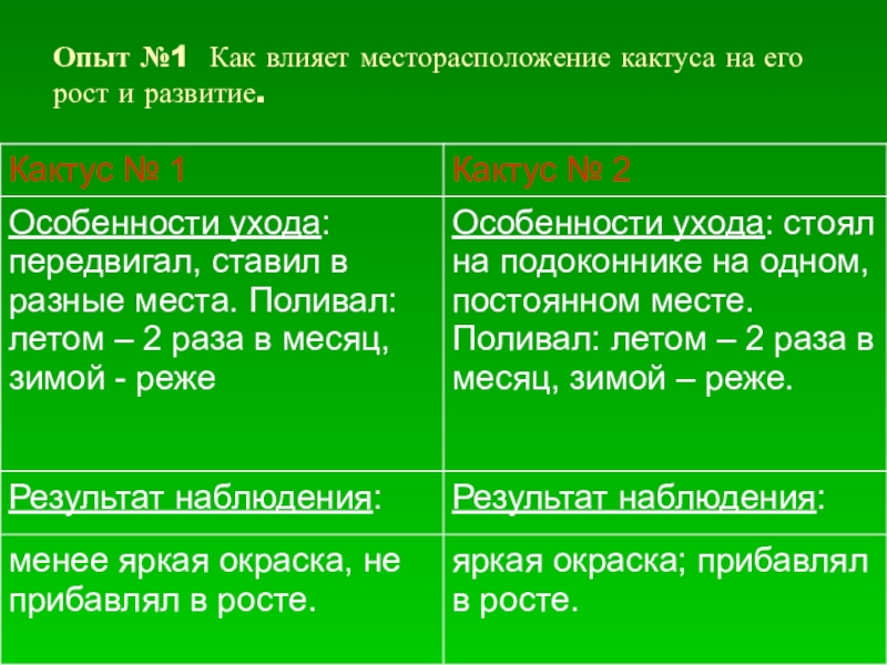 Слайд 14Опыт №1 Как влияет месторасположение кактуса на его рост и развитие.