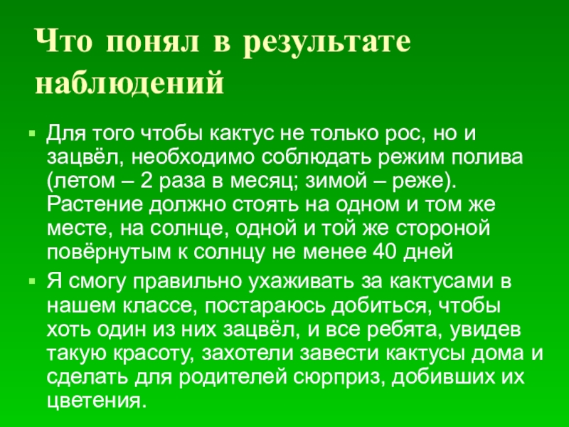 Я смогу правильно ухаживать за кактусами в нашем классе, постараюсь добиться, чтобы хоть один из них зацвёл, и все ребята, увидев такую красоту, захотели завести кактусы дома и сделать для родителей сюрприз, добивших их цветения.