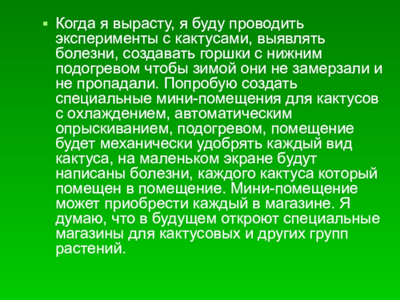 создавать горшки с нижним подогревом чтобы зимой они не замерзали и не пропадали. Попробую создать специальные мини-помещения для кактусов с охлаждением, автоматическим опрыскиванием, подогревом, помещение будет механически удобрять каждый вид кактуса, на маленьком экране будут написаны болезни, каждого кактуса который помещен в помещение. Мини-помещение может приобрести каждый в магазине. Я думаю, что в будущем откроют специальные магазины для кактусовых и других групп растений.
