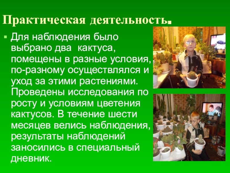 по-разному осуществлялся и уход за этими растениями. Проведены исследования по росту и условиям цветения кактусов. В течение шести месяцев велись наблюдения, результаты наблюдений заносились в специальный дневник.