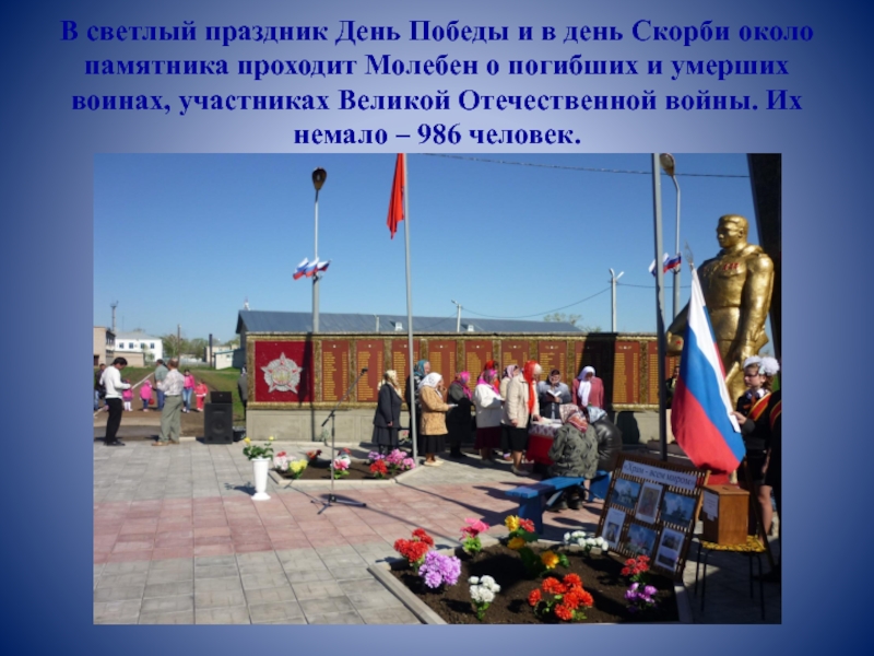 В светлый праздник День Победы и в день Скорби около памятника проходит Молебен о погибших и умерших