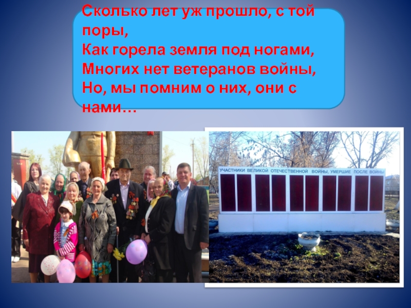 Сколько лет уж прошло, с той поры,Как горела земля под ногами, Многих нет ветеранов войны,Но, мы помним