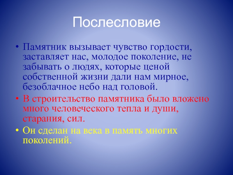 ПослесловиеПамятник вызывает чувство гордости, заставляет нас, молодое поколение, не забывать о людях, которые ценой собственной жизни дали
