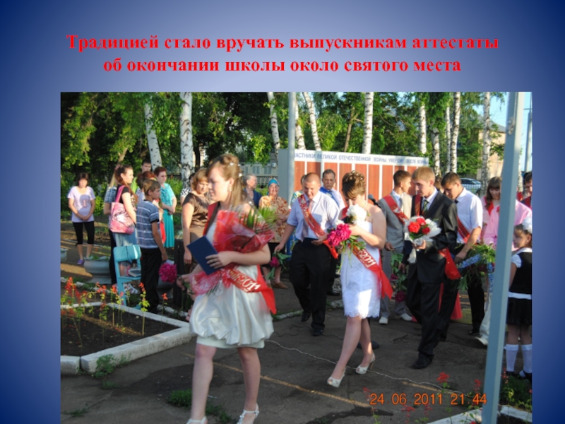 Слайд 22Традицией стало вручать выпускникам аттестаты об окончании школы около святого места