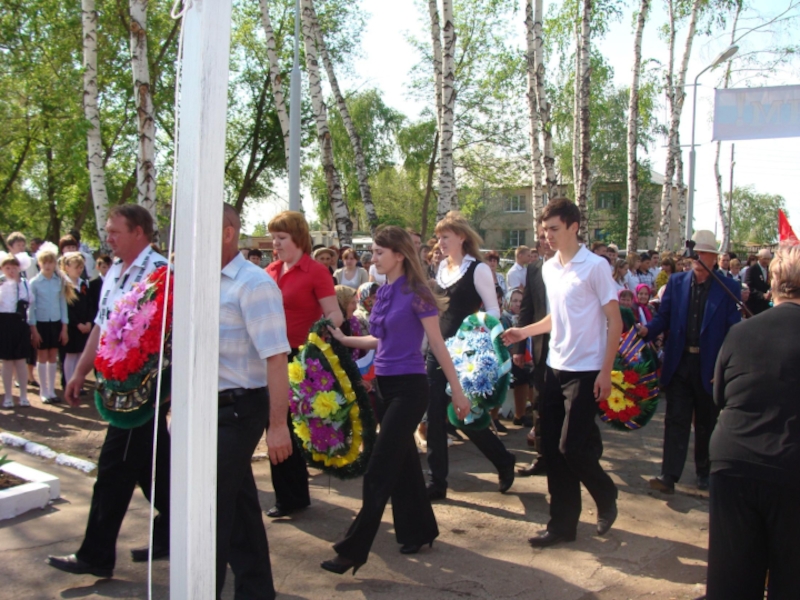 Слайд 199 мая в День Победы около памятника проходит митинг, в котором