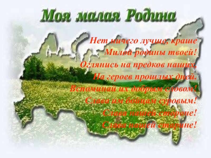 Нет ничего лучше, крашеМилой родины твоей!Оглянись на предков наших,На героев прошлых дней.Вспоминай их добрым словом!Слава им –
