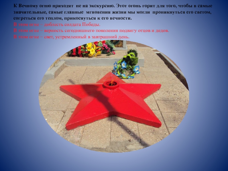 Слайд 5К Вечному огню приходят не на экскурсию. Этот огонь горит для