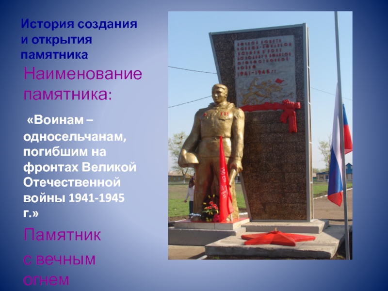 История создания и открытия памятникаНаименование памятника: «Воинам –односельчанам, погибшим на фронтах Великой Отечественной войны 1941-1945 г.» Памятник