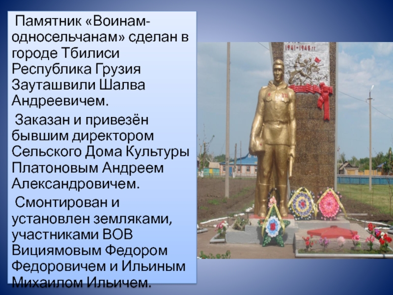 Памятник «Воинам-односельчанам» сделан в городе Тбилиси Республика Грузия Зауташвили Шалва Андреевичем. Заказан и привезён бывшим директором