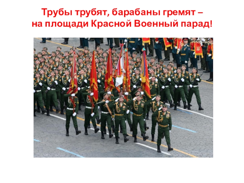 Слайд 17Трубы трубят, барабаны гремят – на площади Красной Военный парад!