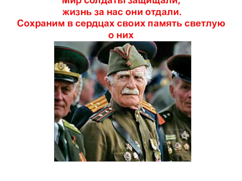 Слайд 15Мир солдаты защищали, жизнь за нас они отдали. Сохраним в сердцах своих