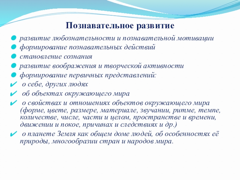 о свойствах и отношениях объектов окружающего мира (форме, цвете, размере, материале, звучании, ритме, темпе, количестве, числе, части и целом, пространстве и времени, движении и покое, причинах и следствиях и др.)