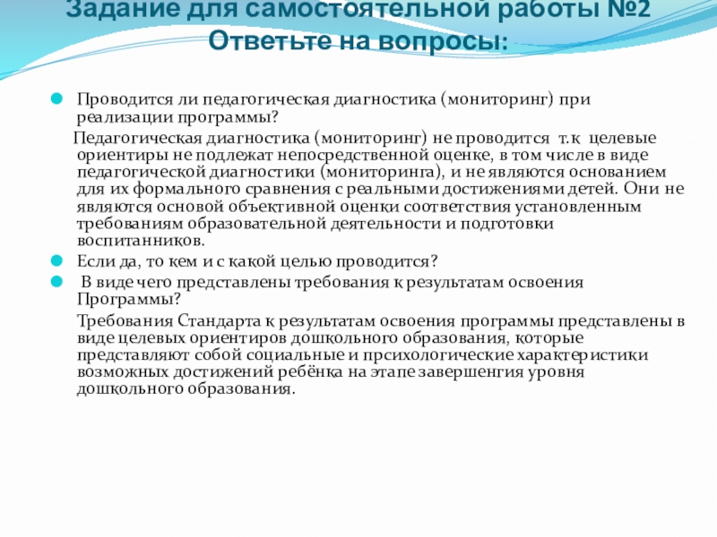 Требования Стандарта к результатам освоения программы представлены в виде целевых ориентиров дошкольного образования, которые представляют собой социальные и прсихологические характеристики возможных достижений ребёнка на этапе завершенгия уровня дошкольного образования.