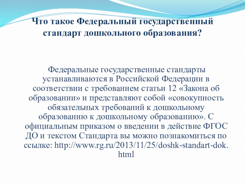 устанавливаются в Российской Федерации в соответствии с требованием статьи 12 «Закона об образовании» и представляют собой «совокупность обязательных требований к дошкольному образованию к дошкольному образованию». С официальным приказом о введении в действие ФГОС ДО и текстом Стандарта вы можно познакомиться по ссылке: http://www.rg.ru/2013/11/25/doshk-standart-dok.html