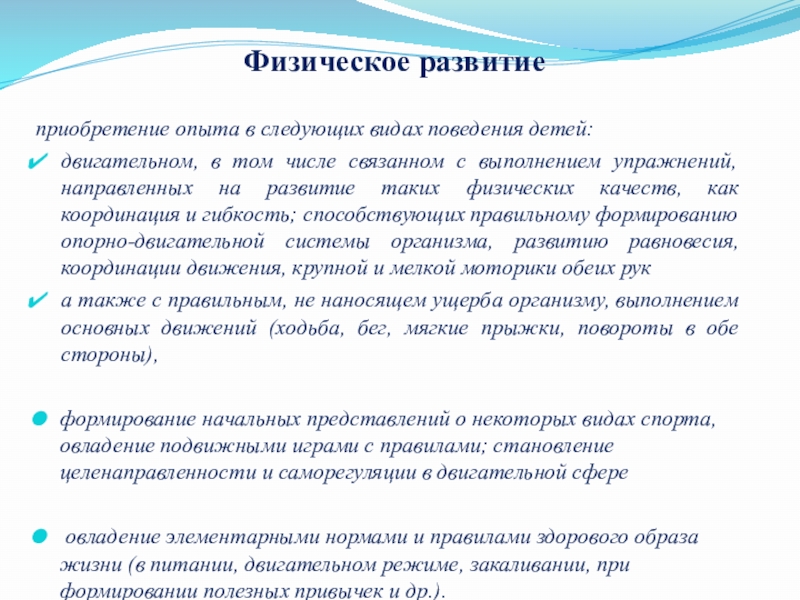 овладение элементарными нормами и правилами здорового образа жизни (в питании, двигательном режиме, закаливании, при формировании полезных привычек и др.).