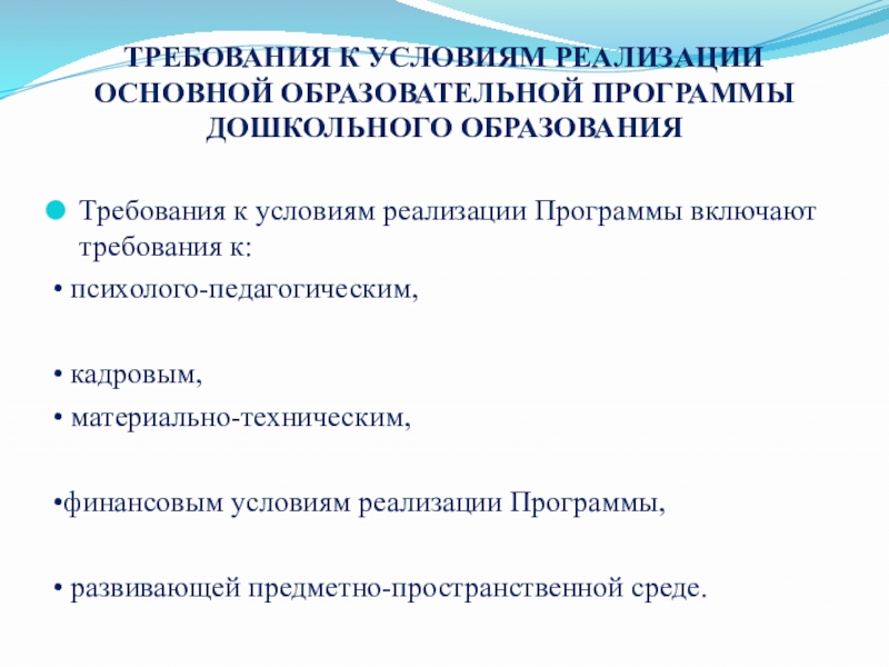 Слайд 11ТРЕБОВАНИЯ К УСЛОВИЯМ РЕАЛИЗАЦИИ ОСНОВНОЙ ОБРАЗОВАТЕЛЬНОЙ ПРОГРАММЫ ДОШКОЛЬНОГО ОБРАЗОВАНИЯ