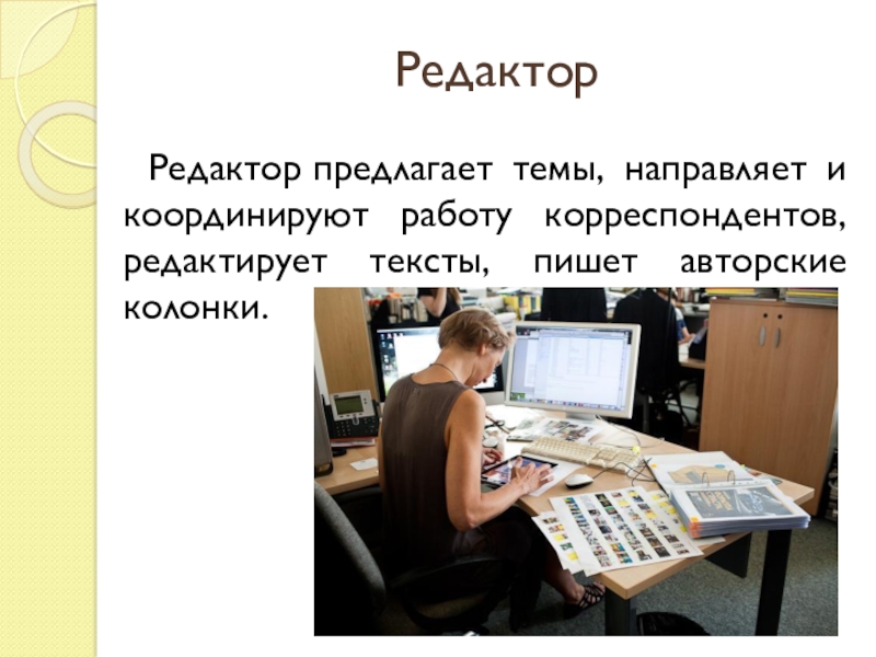 Редактор предлагает темы, направляет и координируют работу корреспондентов, редактирует тексты,