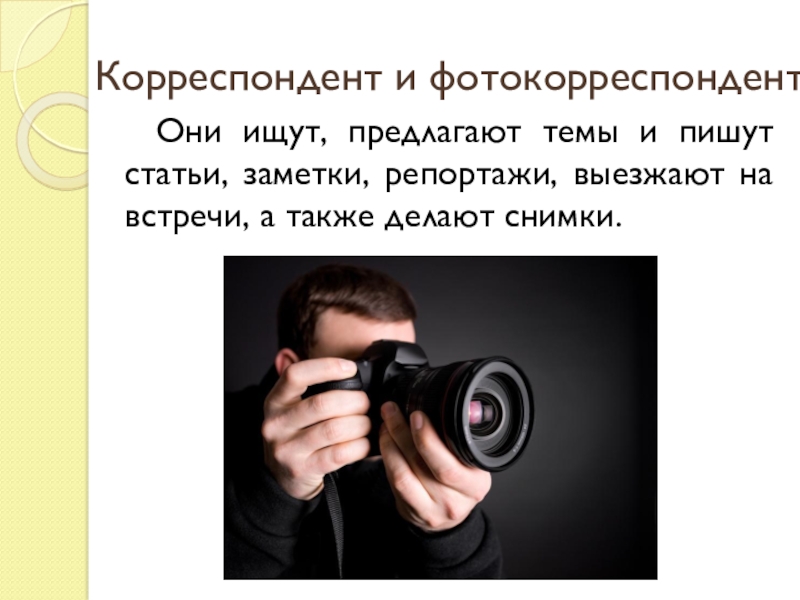 Корреспондент и фотокорреспондент  Они ищут, предлагают темы и пишут статьи, заметки, репортажи, выезжают на встречи,