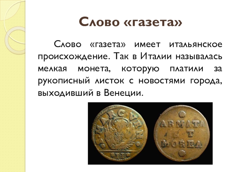 Слово «газета»  Слово «газета» имеет итальянское происхождение. Так в Италии называлась мелкая монета, которую платили за