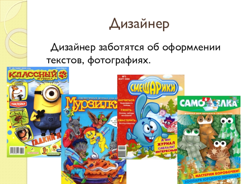 Дизайнер  Дизайнер заботятся об оформлении текстов, фотографиях.