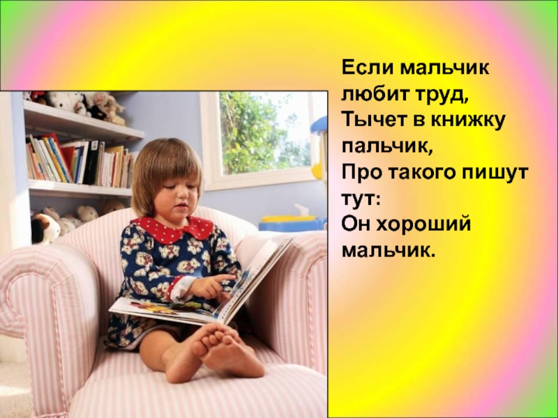 Слайд 14Если мальчик любит труд, Тычет в книжку пальчик, Про такого пишут тут: Он хороший