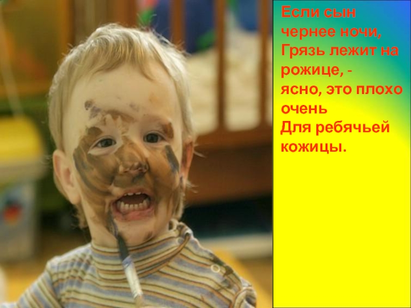 Если сын чернее ночи, Грязь лежит на рожице, - ясно, это плохо очень Для ребячьей кожицы.