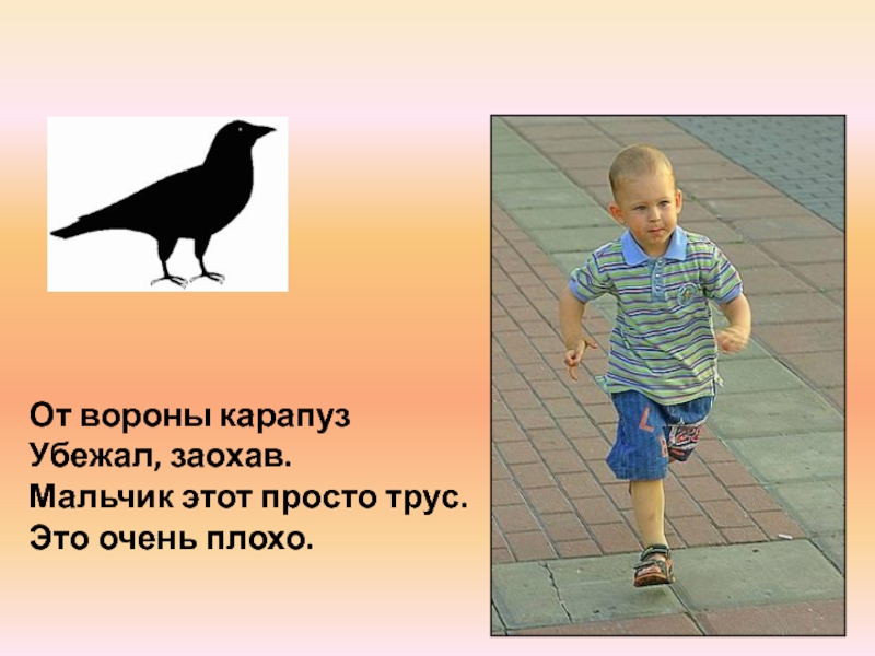 Слайд 15От вороны карапуз Убежал, заохав. Мальчик этот просто трус. Это очень плохо.