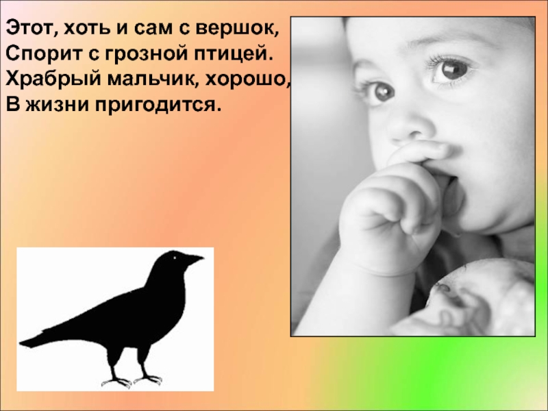 Слайд 16Этот, хоть и сам с вершок, Спорит с грозной птицей. Храбрый мальчик, хорошо, В
