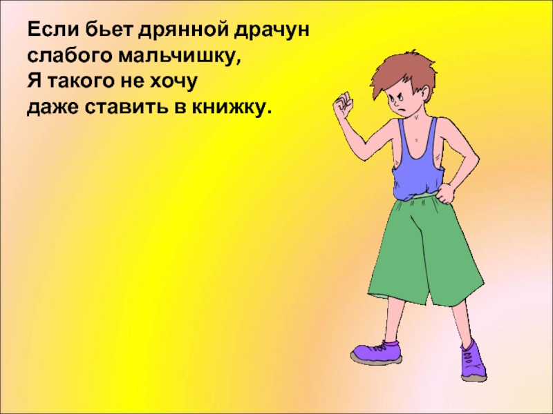 Слайд 11Если бьет дрянной драчун слабого мальчишку, Я такого не хочу даже ставить в