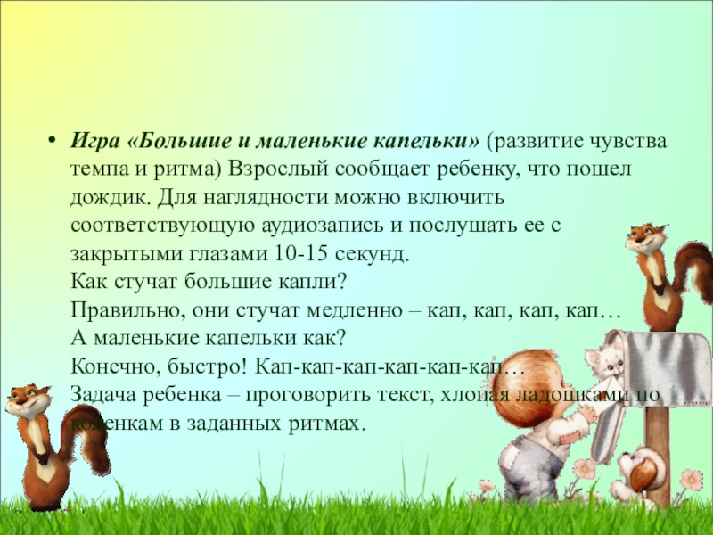 Слайд 10Игра «Большие и маленькие капельки» (развитие чувства темпа и ритма) Взрослый сообщает