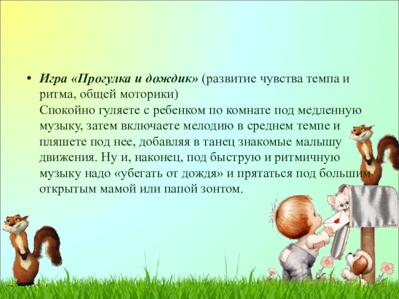 Слайд 11Игра «Прогулка и дождик» (развитие чувства темпа и ритма, общей моторики)