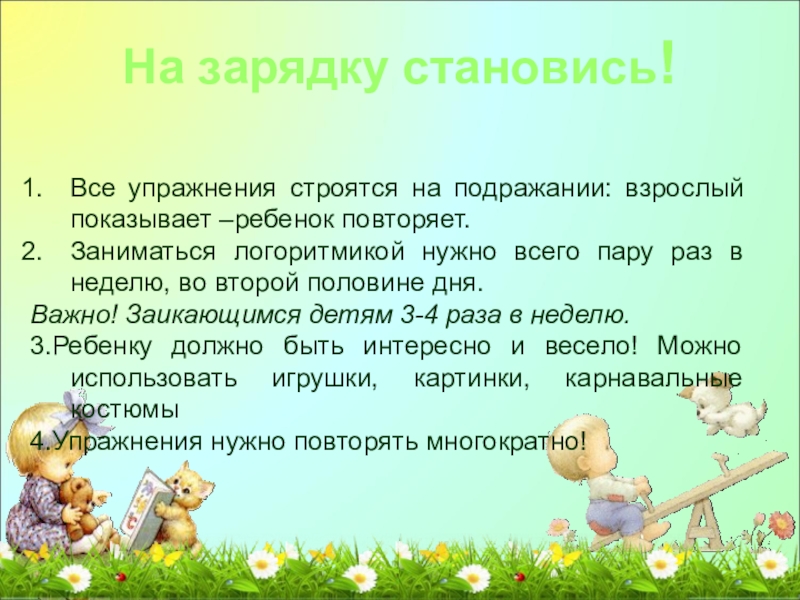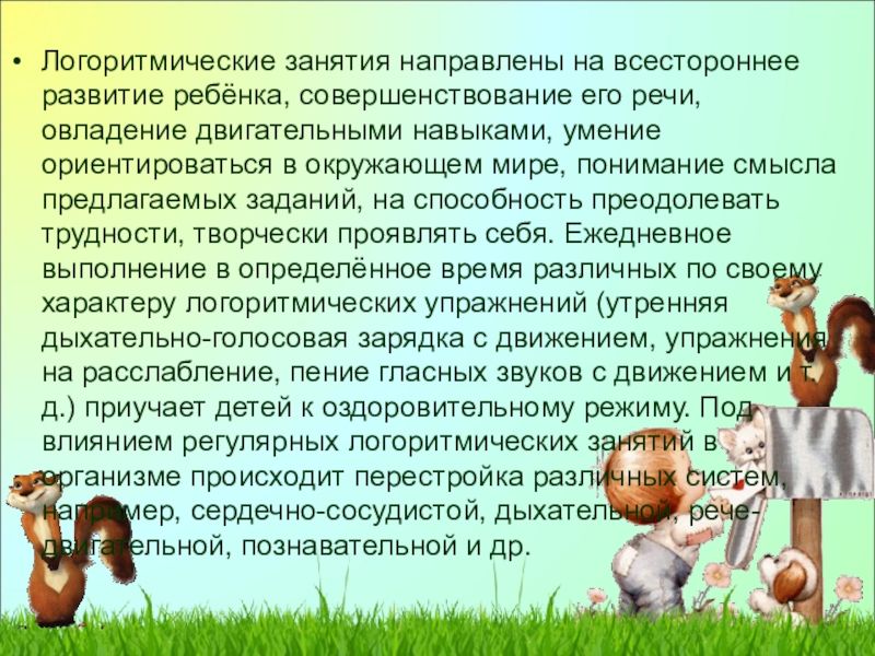 Слайд 14Логоритмические занятия направлены на всестороннее развитие ребёнка, совершенствование его речи, овладение
