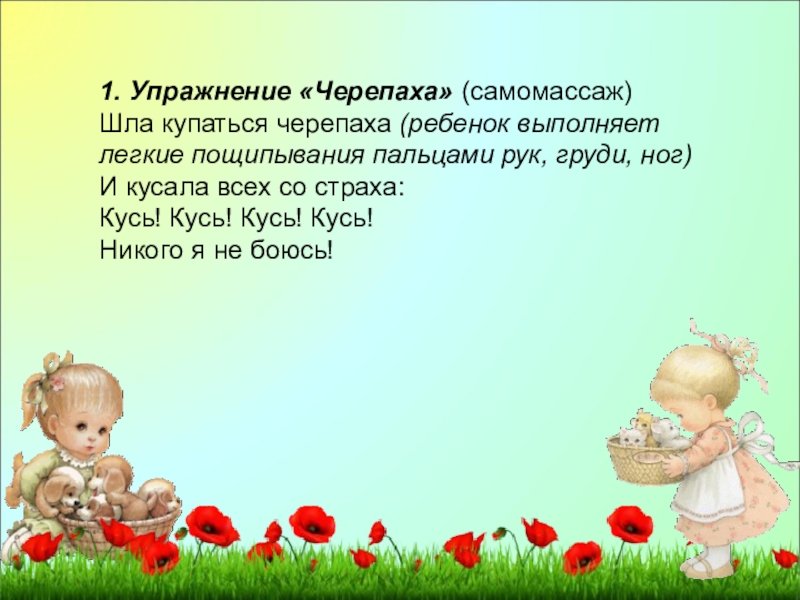 Шла купаться черепаха (ребенок выполняет легкие пощипывания пальцами рук, груди,