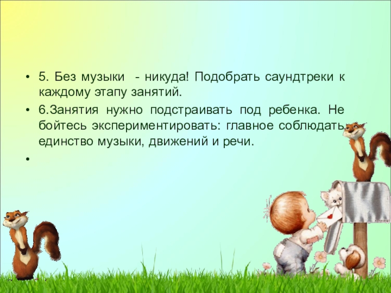 Слайд 75. Без музыки - никуда! Подобрать саундтреки к каждому этапу занятий.