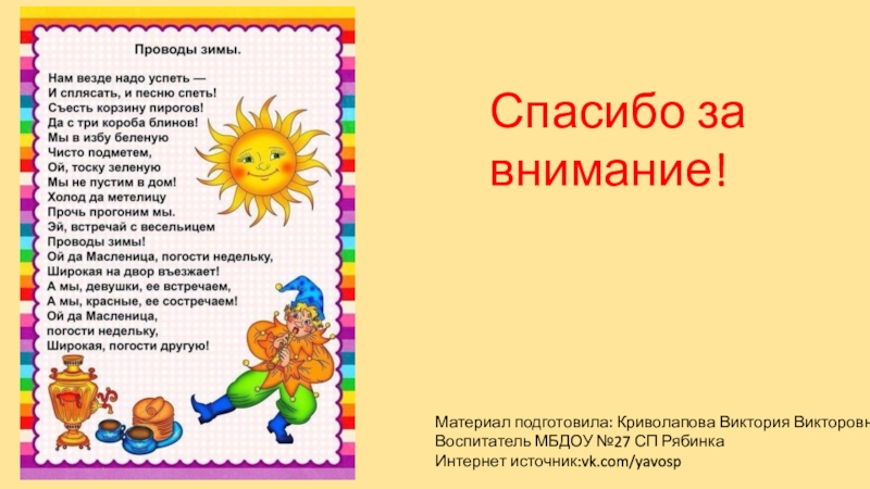 Спасибо за внимание!Материал подготовила: Криволапова Виктория Викторовна Воспитатель МБДОУ №27 СП РябинкаИнтернет источник:vk.com/yavosp