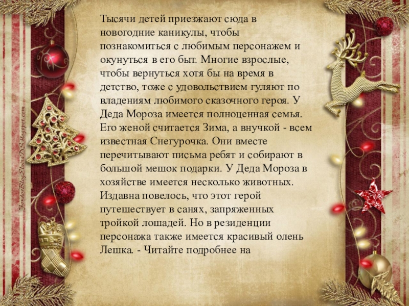 персонажем и окунуться в его быт. Многие взрослые, чтобы вернуться хотя бы на время в детство, тоже с удовольствием гуляют по владениям любимого сказочного героя. У Деда Мороза имеется полноценная семья. Его женой считается Зима, а внучкой - всем известная Снегурочка. Они вместе перечитывают письма ребят и собирают в большой мешок подарки. У Деда Мороза в хозяйстве имеется несколько животных. Издавна повелось, что этот герой путешествует в санях, запряженных тройкой лошадей. Но в резиденции персонажа также имеется красивый олень Лешка. - Читайте подробнее на