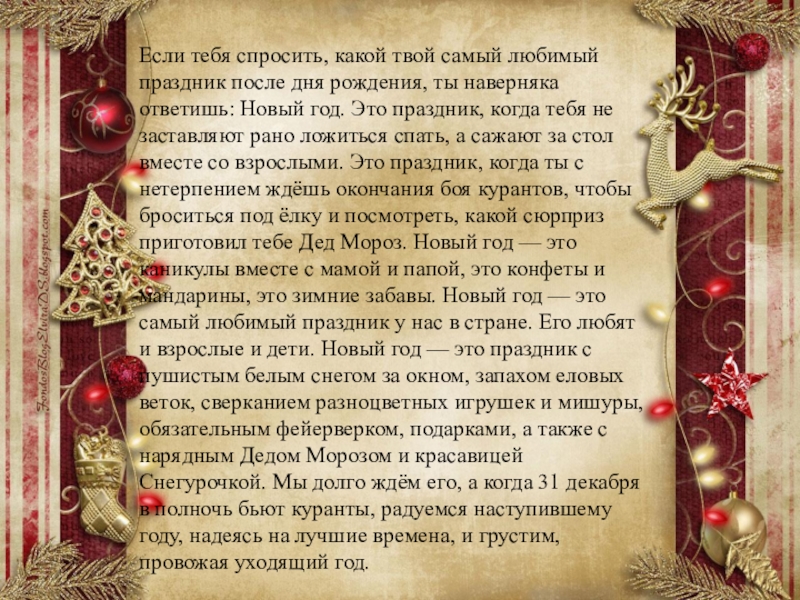 ты наверняка ответишь: Новый год. Это праздник, когда тебя не заставляют рано ложиться спать, а сажают за стол вместе со взрослыми. Это праздник, когда ты с нетерпением ждёшь окончания боя курантов, чтобы броситься под ёлку и посмотреть, какой сюрприз приготовил тебе Дед Мороз. Новый год — это каникулы вместе с мамой и папой, это конфеты и мандарины, это зимние забавы. Новый год — это самый любимый праздник у нас в стране. Его любят и взрослые и дети. Новый год — это праздник с пушистым белым снегом за окном, запахом еловых веток, сверканием разноцветных игрушек и мишуры, обязательным фейерверком, подарками, а также с нарядным Дедом Морозом и красавицей Снегурочкой. Мы долго ждём его, а когда 31 декабря в полночь бьют куранты, радуемся наступившему году, надеясь на лучшие времена, и грустим, провожая уходящий год.