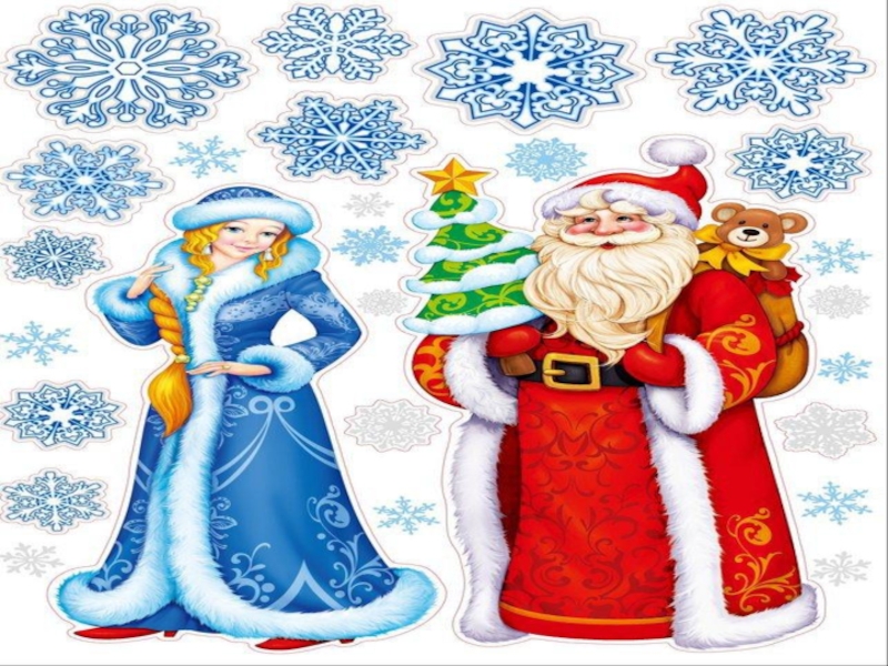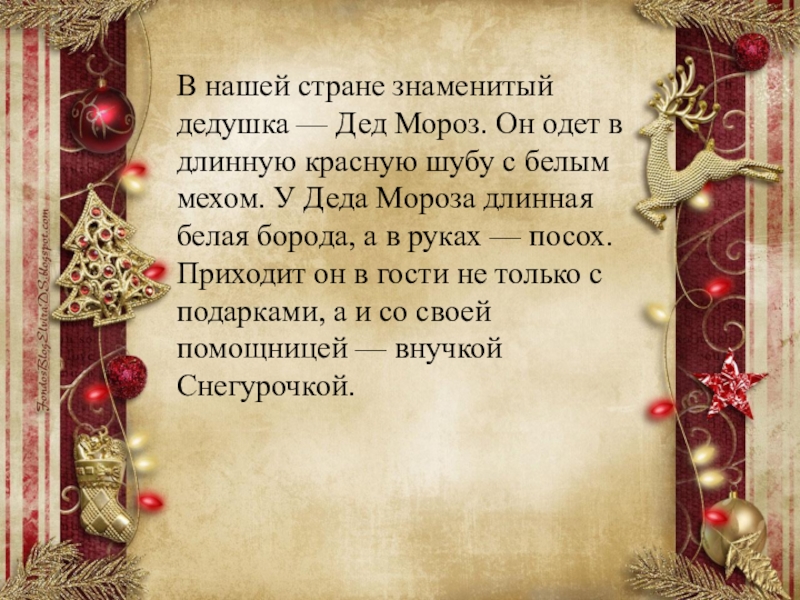 длинную красную шубу с белым мехом. У Деда Мороза длинная белая борода, а в руках — посох. Приходит он в гости не только с подарками, а и со своей помощницей — внучкой Снегурочкой.