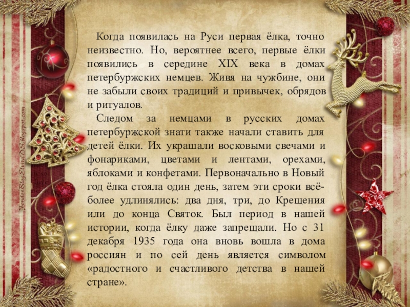 Следом за немцами в русских домах петербуржской знати также начали ставить для детей ёлки. Их украшали восковыми свечами и фонариками, цветами и лентами, орехами, яблоками и конфетами. Первоначально в Новый год ёлка стояла один день, затем эти сроки всё- более удлинялись: два дня, три, до Крещения или до конца Святок. Был период в нашей истории, когда ёлку даже запрещали. Но с 31 декабря 1935 года она вновь вошла в дома россиян и по сей день является символом «радостного и счастливого детства в нашей стране».